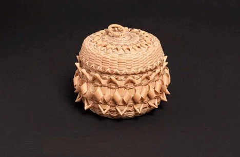 Caroline Gold, Sewing Basket, 2010. White ash, sweetgrass ornamentation. Photograph: Krista Comeau